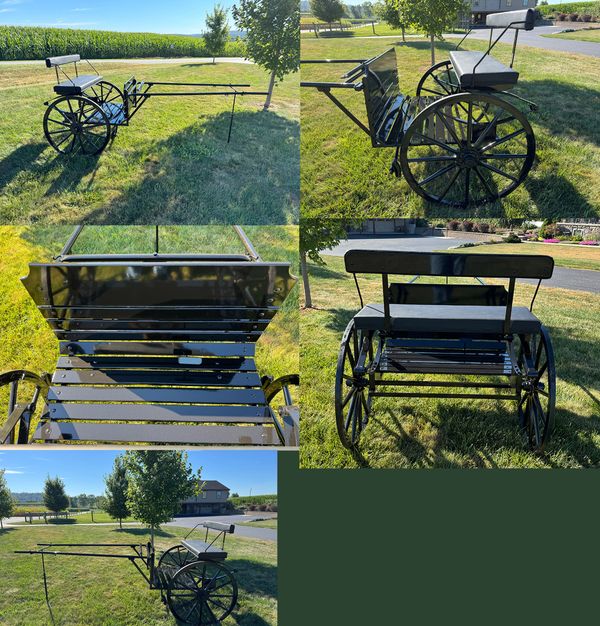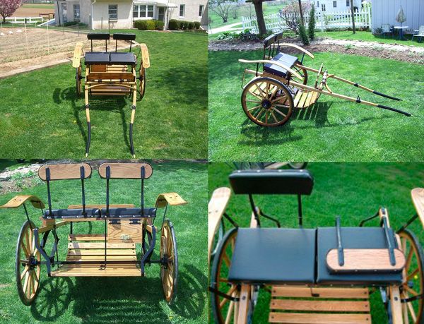 Easy Entry with wood wheels and wood shafts, This is our most popular cart, this cart can be dressed up for showing with our many add on options on the accessories page. seat is 12x30 shafts are 48" long wheels are 24" we also build these carts for ponies. Price for cart $1595.00