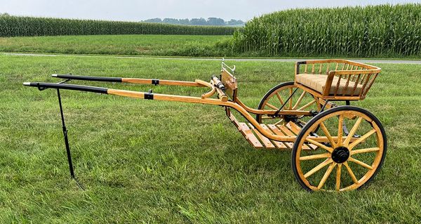 A very smooth riding cart with its half elliptic Suspension system and adjustable spindle seat. This cart is very easy to get in and out of and yet is very stylish with its double bend shafts and spindle seat. This cart was stained in Golden Oak, for extra fee you can get it hand painted pin straining.